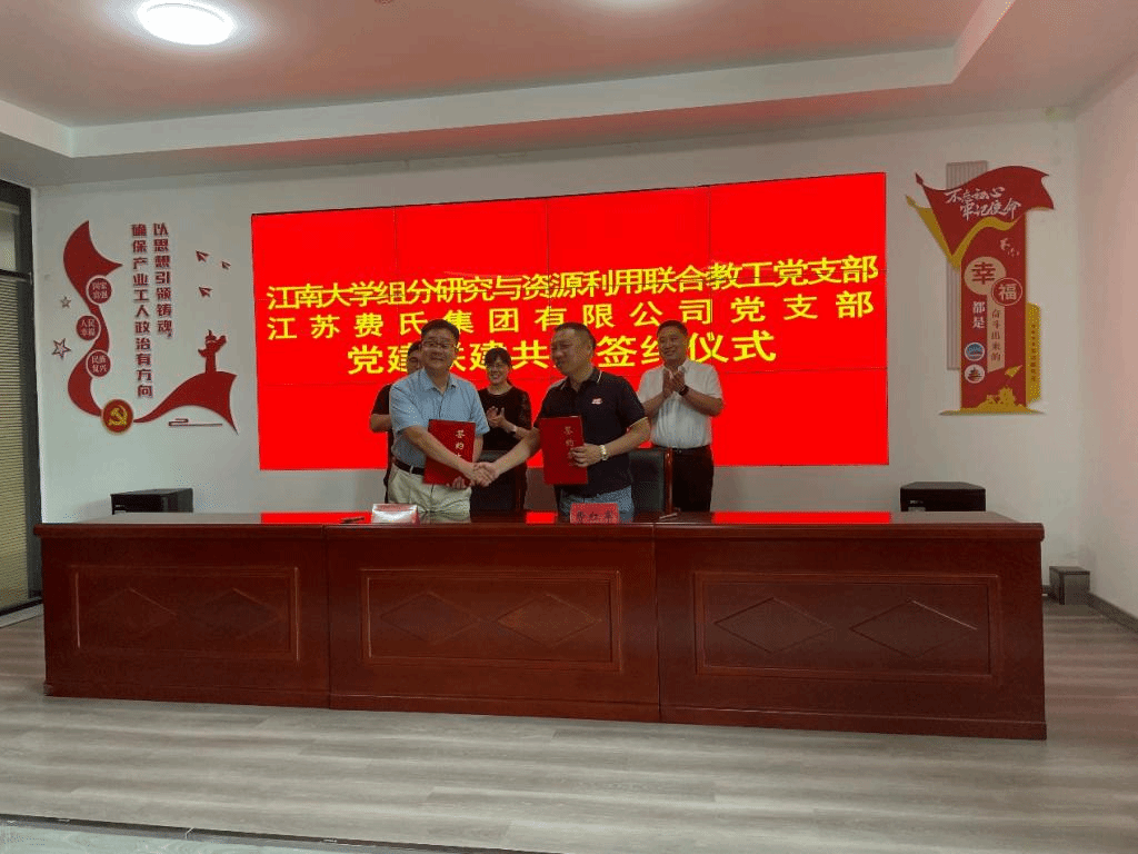 食品组分与物性研究中心、食品资源与综合利用研究所联合教工党支部与江苏费氏集团有限公司党支部签订了《党建联建共建协议书》。同时,江南大学大学生社会实践基地授牌仪式在江苏费氏集团有限公司举行,标志着双方合作迈入了新的阶段。