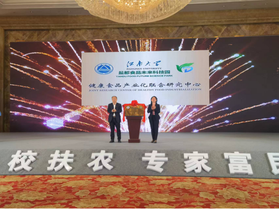 大会上,顾正彪副校长和盐城市副市长、盐都区委书记王娟女士为“盐都食品未来科技园-江南大学健康食品产业化联合研究中心”共同揭牌,标志着江南大学和盐都区围绕食品(农产品)加工产业在当地良性、跨域式发展的全面合作正式开启。此外,顾正彪副校长还和江苏省农业农村厅一级巡视员蔡恒先生、扬州大学张洪程院士、盐城市副市长王娟女士等与会领导一起启动盐都区“十大院校联产业、百名专家驻基地”乡村人才振兴行动。在大会“才智分享”环节,程力副院长作了题为“食品未来科技园发展前瞻”的报告,报告中向与会各界人士介绍了我国食品工业的发展现状、趋势及食品产业园区主要功能建设模块,并结合国内优秀食品园区典型案例深入浅出分析盐都区大力食品(农产品)加工产业的必要性和可行性,同时也对盐都食品未来科技园的发展提出若干重要建议。