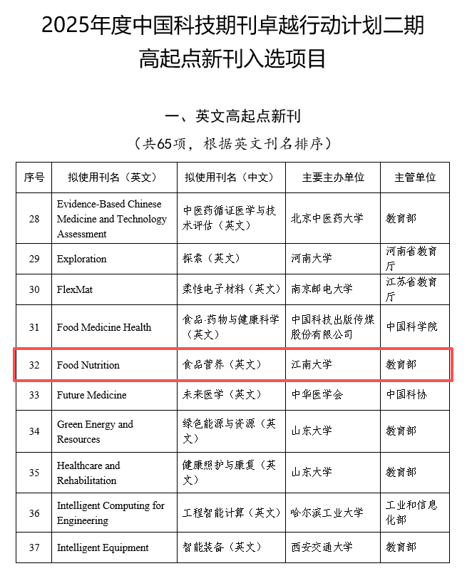 12月5日,中国科协正式公布了2025年度中国科技期刊卓越行动计划二期高起点新刊入选项目。经过严格的专家评审和公示程序,由江南大学主办的英文开放获取期刊《食品营养(英文)》(Food Nutrition)成功入选。这是Food Nutrition在创刊首年获得的一项重要国家级项目支持,标志着期刊的学术定位与发展潜力获得学界与科技出版界的高度认可。