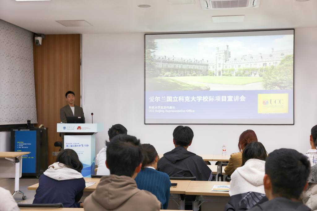 UCC北京代表处招聘专员赵子豪为学院本科生作联合培养项目宣讲,详细介绍项目的课程设置、申请条件及奖学金政策。该项目旨在为麻将胡了试玩